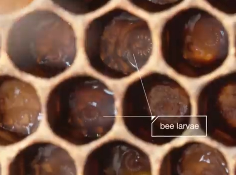After they feed, the larvae crawl out of the hive and pupate in nearby soil, then return as adults to continue the cycle.