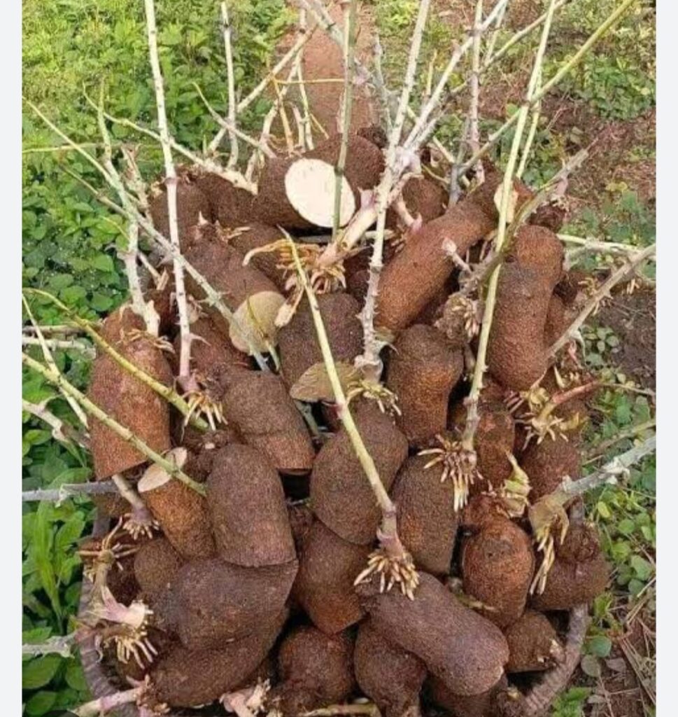 A. DOUBLE HARVESTING: The plant in the field is harvested twice. After exhuming of the yam from the soil, the head of the yam connected to the vine is cut off and replanted. It is later harvested again after development.