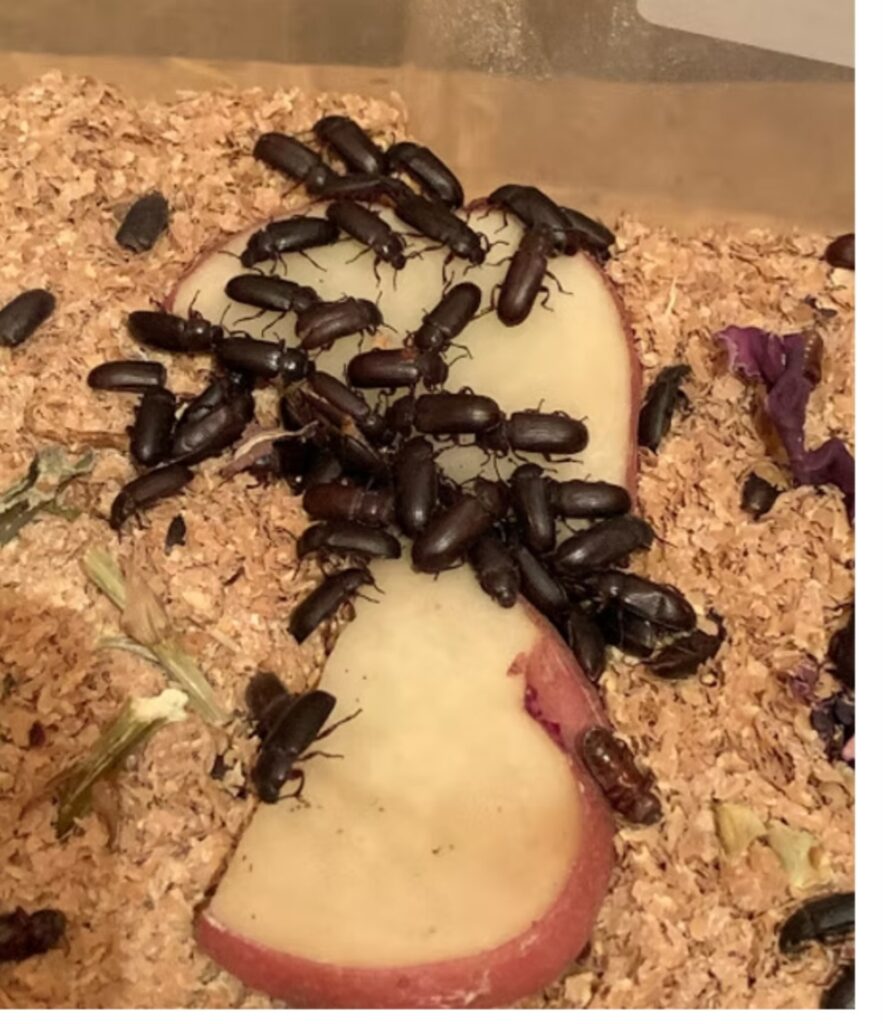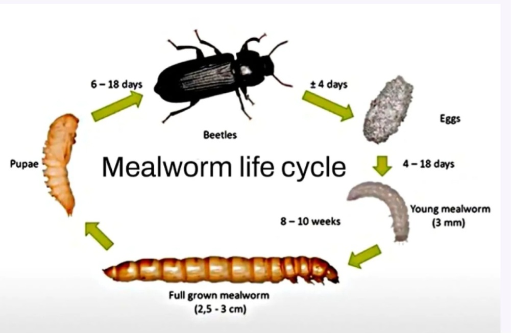 The mealworm beetle is a holometabolic insects, that goes through four life stages: egg, larva, pupa, and adult. They start as thiny eggs that hatches into mealworms and eventually transform into the adult beetles.